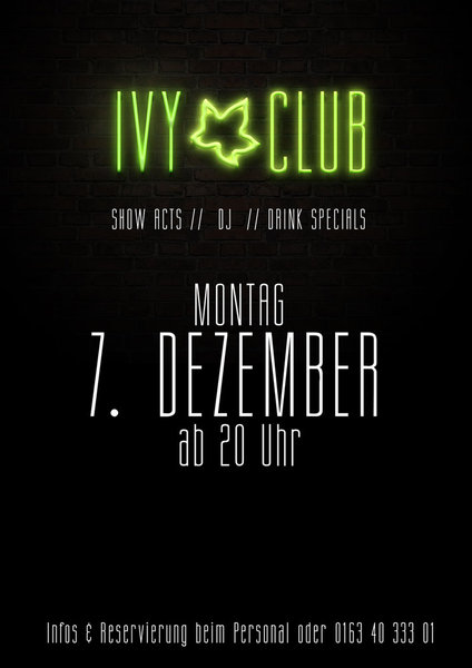 Am 7. Dezember ist es wieder soweit, der Ivy Club lädt alle, die früh in der Woche schon wieder die Füße nicht stillhalten können ein, sich als Gäste des Ivys über gute Musik, Getränkespecials und einen angenehmen Club-Abend nach der Arbeit oder dem Weihnachtsmarktbesuch zu freuen.