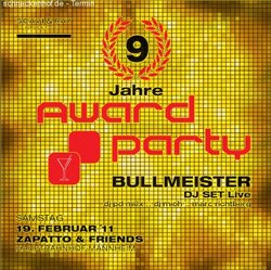 Neun Jahre ist es mittlerweile her, dass die Award Party im Zapatto ihre Geburtsstunde feierte. Diesen Samstag soll der neunjährige Geburtstag natürlich gebührend gefeiert werden. Auch dieses Mal wird einiges geboten auf der Award Party, so könnt ihr zu House und Minimal Sounds von DJ Mioh und DJ Marc Richtberg das Tanzbein schwingen. Aber auch für diejenigen unter euch, die nicht auf House und Minimal abfahren, ist gesorgt. Auf dem unteren Floor wird DJ pd M@x euch mit der besten Partymusik versorgen, so dass alle auf ihre Kosten kommen werden. Ein ganz besonderes Party-Highlight ist der Auftritt der BULLMEISTER, die auf dem oberen Partyfloor mit ihrem neuen Programm live auftreten.