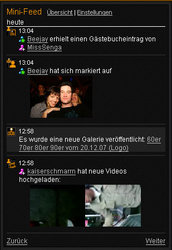 | Artikel: Neues Feature: Mini-Feed![ schneckenhof.de ] 20.12.2007  |   Klicks: 3395   |   Kommentare: 28    |   Autor: Selbstfinder Neues Feature: Mini-Feed! Wer kennt es nicht? Die Buddyliste ist auf eine stattliche Größe angewachsen, aber man kann die neuesten Änderungen deswegen nicht mehr mitverfolgen. Profilbilder, Galeriefotos, Eventeintragungen, alles geht an einem vorbei.